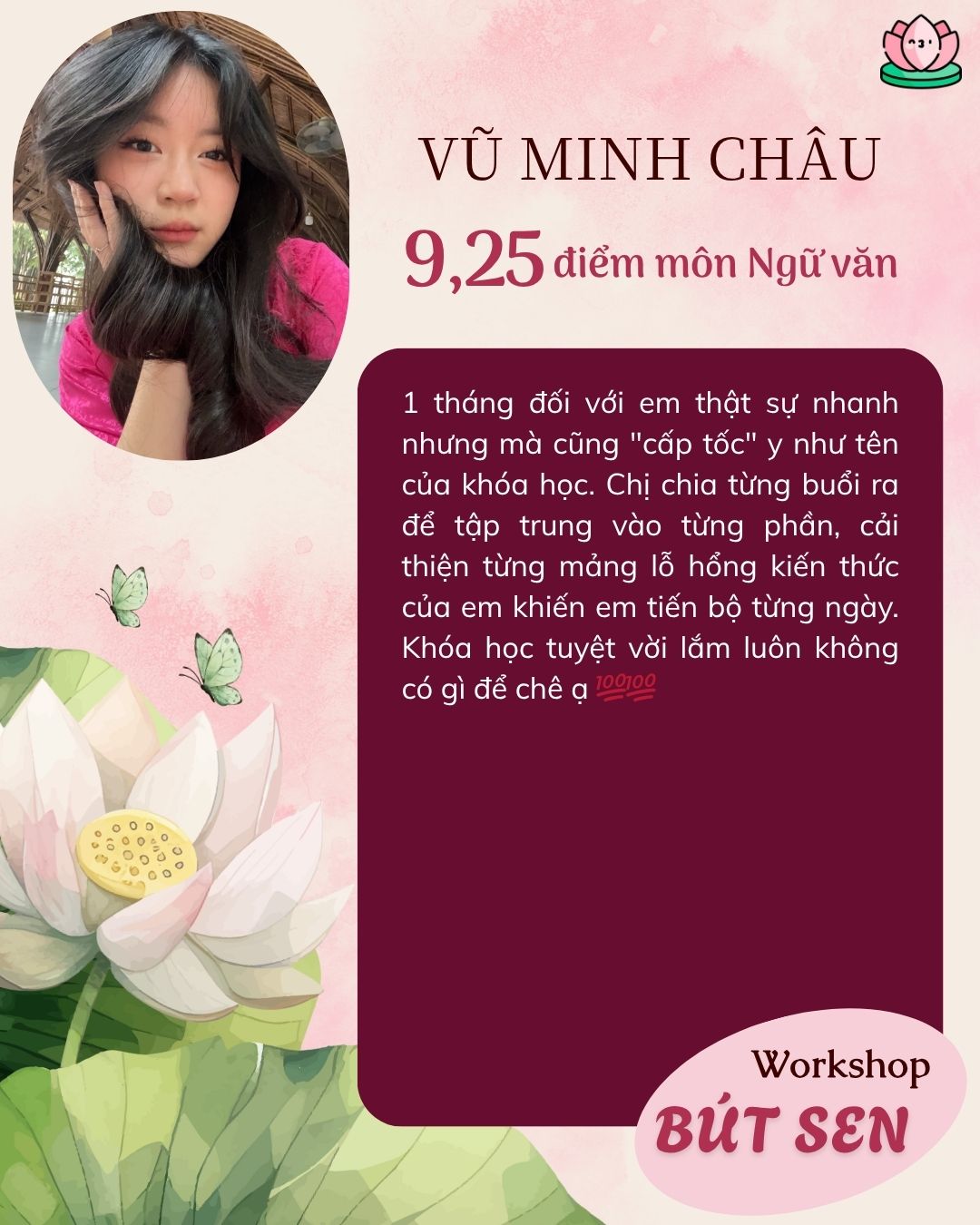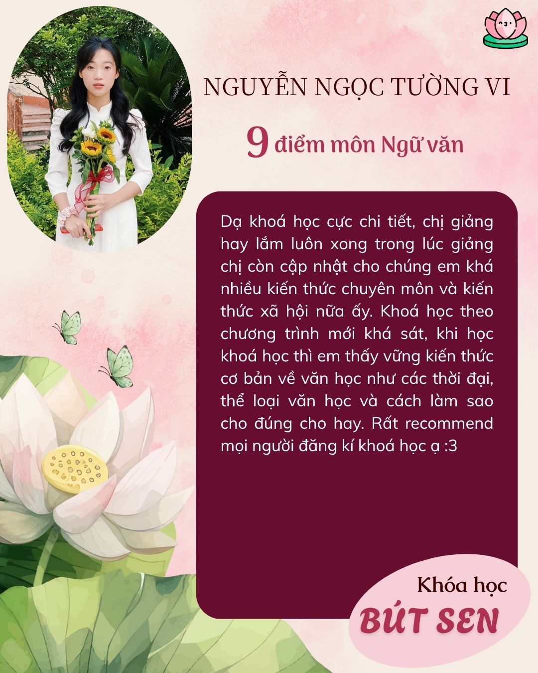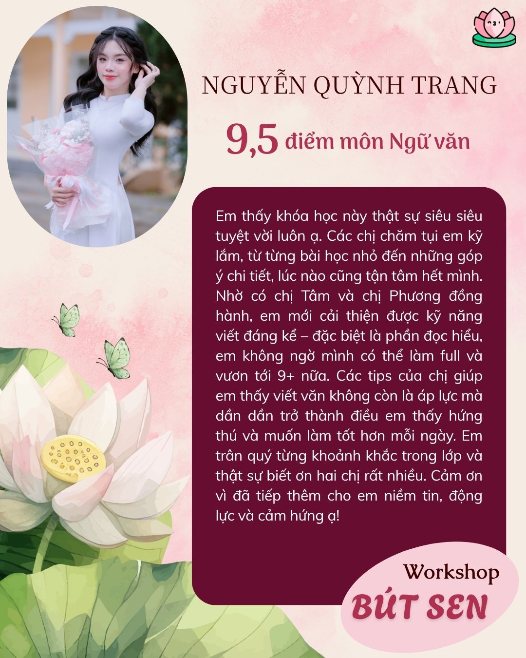 Những học sinh của chị Tâm đã đạt từ 9 điểm trở lên trong môn Ngữ văn kỳ thi vào lớp 10 đều nhờ vào bí quyết mà chính chị Tâm sẽ chia sẻ trong khóa học Bút Hướng Dương. (Có thể ứng dụng được cho bài thi trường Chuyên)