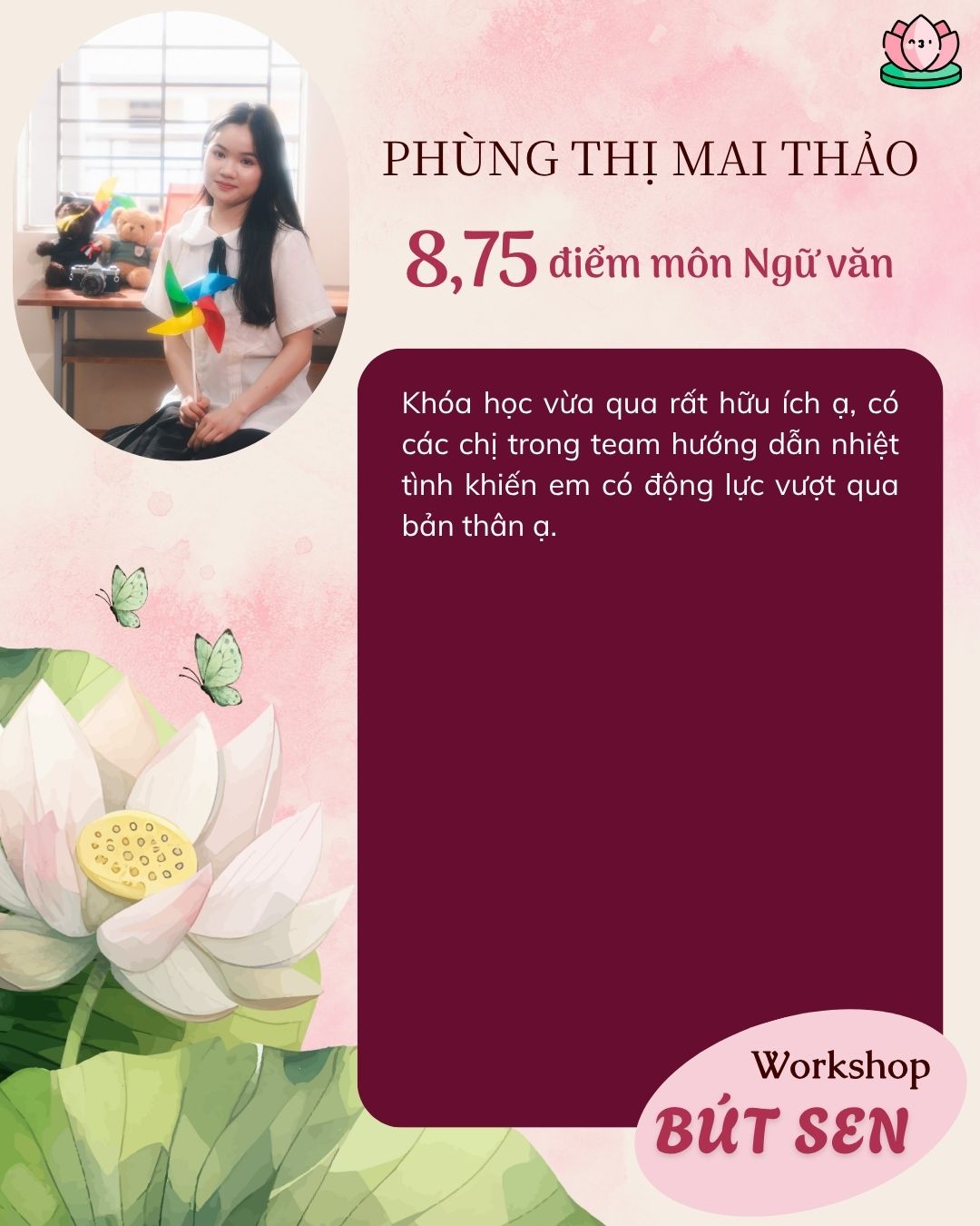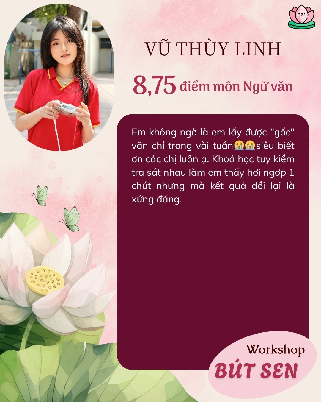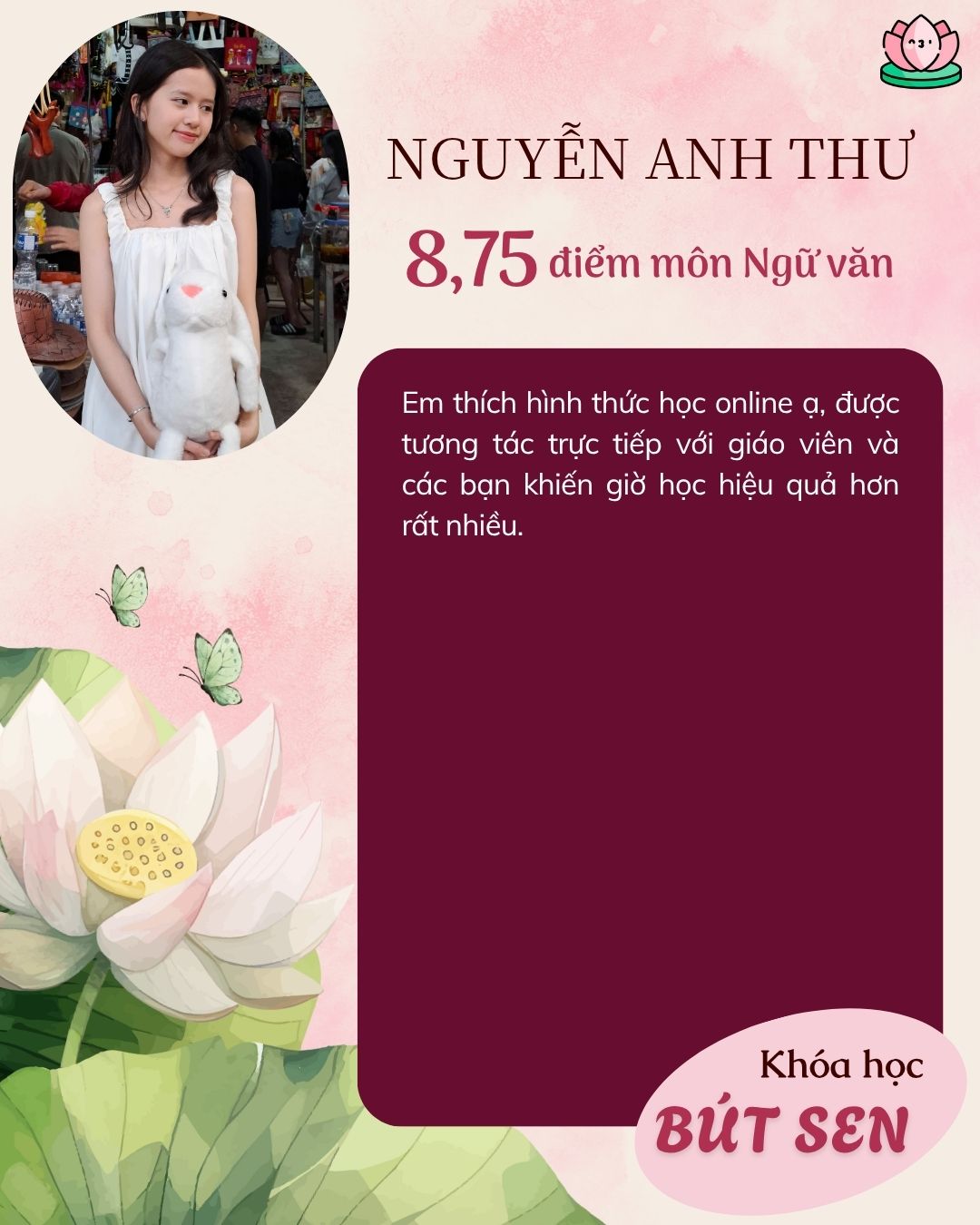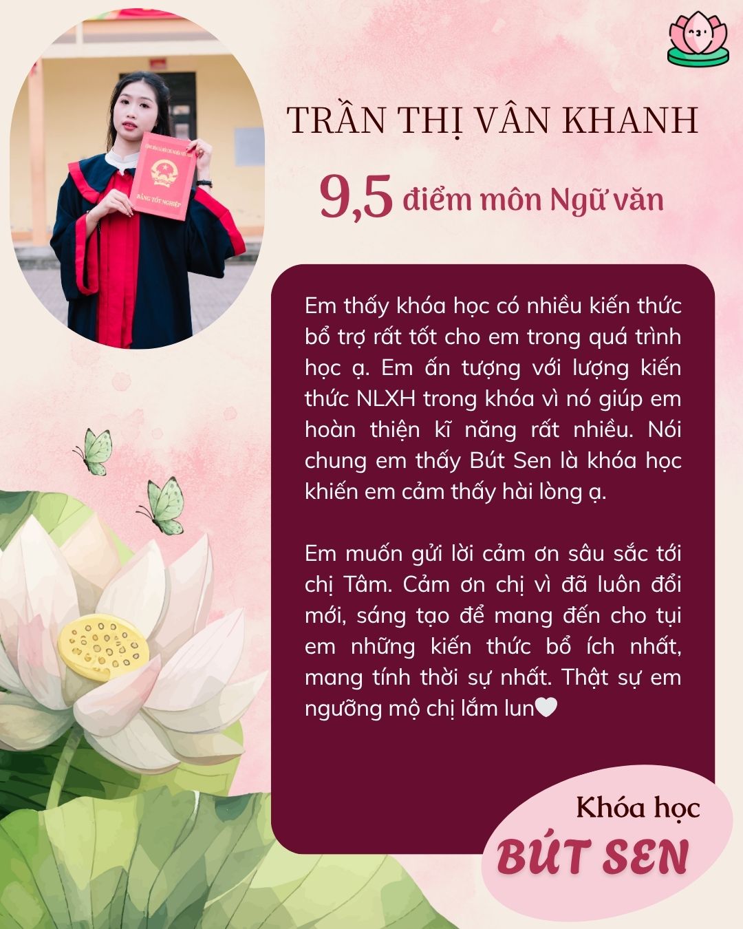 Những học sinh của chị Tâm đã đạt từ 9 điểm trở lên trong môn Ngữ văn kỳ thi vào lớp 10 đều nhờ vào bí quyết mà chính chị Tâm sẽ chia sẻ trong khóa học Bút Hướng Dương. (Có thể ứng dụng được cho bài thi trường Chuyên)